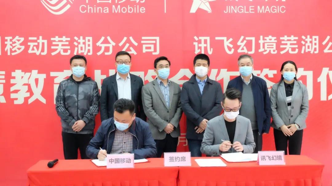 鏡湖區(qū)副區(qū)長(zhǎng)束曉偉及政府領(lǐng)導(dǎo)、相關(guān)單位負(fù)責(zé)人,訊飛幻境政企事業(yè)部執(zhí)行總裁李寧、中國(guó)移動(dòng)蕪湖分公司總經(jīng)理?xiàng)钫鸬瘸鱿⒁?jiàn)證簽約儀式,共同為雙方“智慧教育合作基地”揭牌。